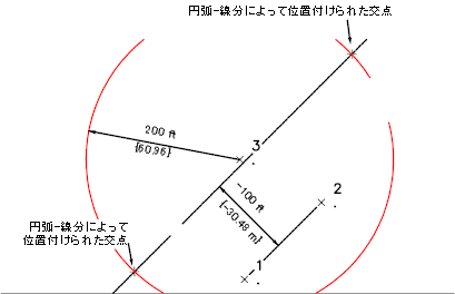 交点は、ポイント 3 を中心とする半径 200 の円弧と、ポイント 1 とポイント 2 間に作成された左オフセット距離 100 の線分の間に配置されます。