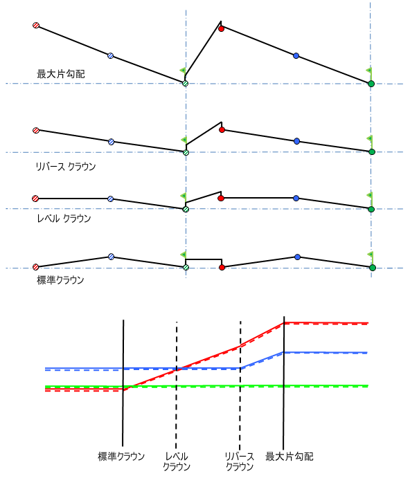 横断勾配摺り付け図の説明については、「概要 - 横断勾配摺り付け回転軸の基点設定方法」を参照してください。