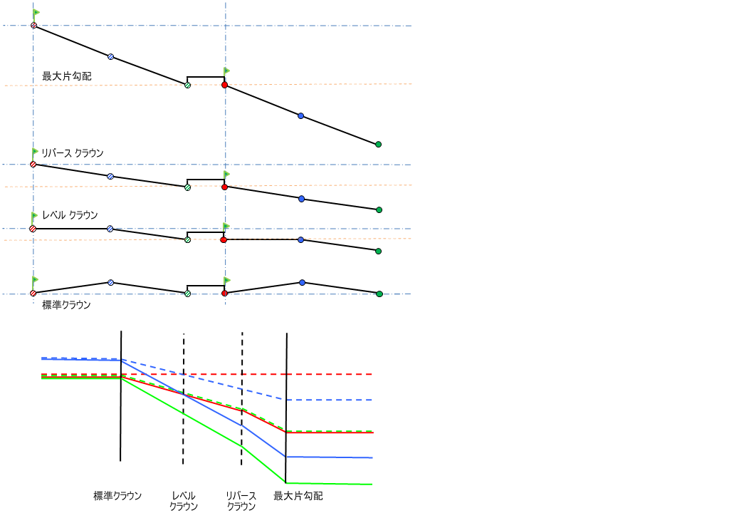 横断勾配摺り付け図の説明については、「概要 - 横断勾配摺り付け回転軸の基点設定方法」を参照してください。
