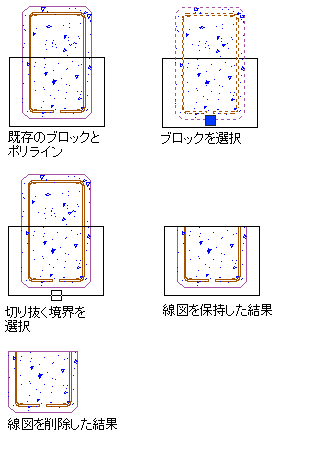 をクリックします。 最初に選択した線図のうちで、切り抜く境界の外側にあるすべての部分が削除されます。切り抜く境界を削除する場合、その切り抜いた領域内の境界が閉じている図形に対しては境界が再作図されます。しかし、切り抜いた境界が開いているオブジェクトについては開いたままです。