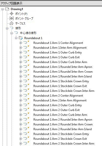 [プロスペクター]ツリーの[ラウンドアバウト交差点]コレクションを使用して、図面内のラウンドアバウト交差点にアクセスすることができます。