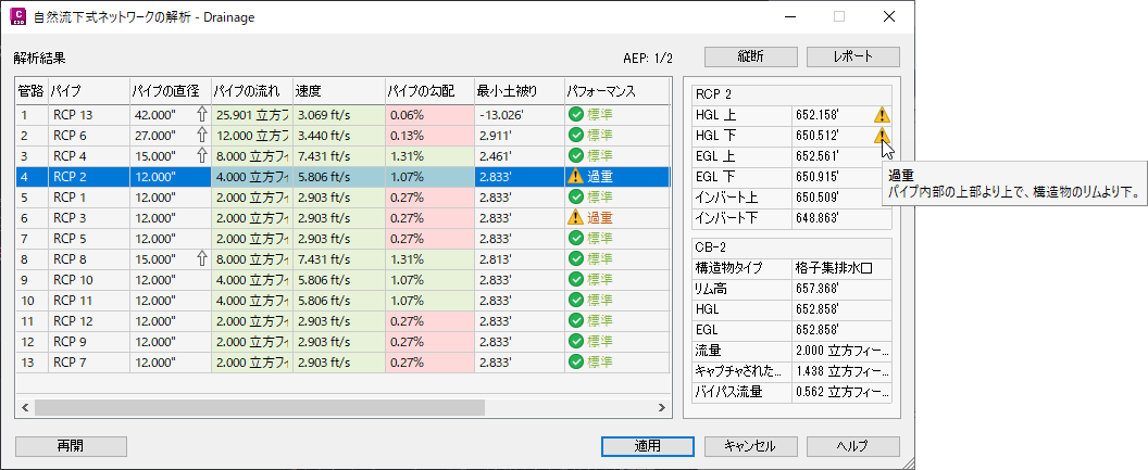 [自然流下式ネットワークの解析]ダイアログ ボックスで[解析]ボタンをクリックすると、[結果]ページが表示されます。