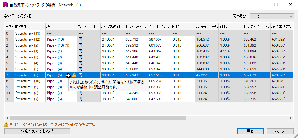 詳細については、「自然流下式ネットワーク解析の排水溝の構造パラメータをマッピングするには」を参照してください。