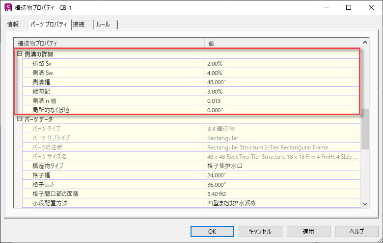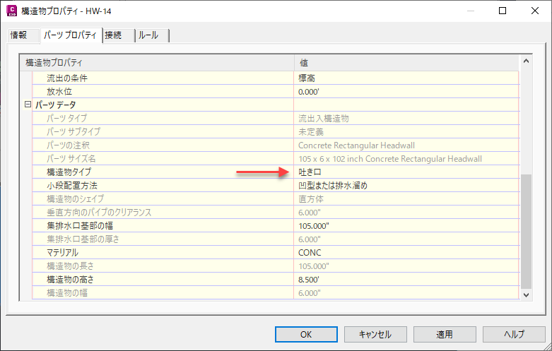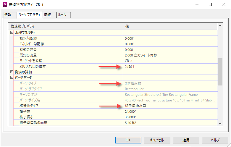 パーツ ビルダで作成されたパーツのパラメータを、[自然流下式ネットワークの解析]コマンドに必要なパラメータにマッピングできます。