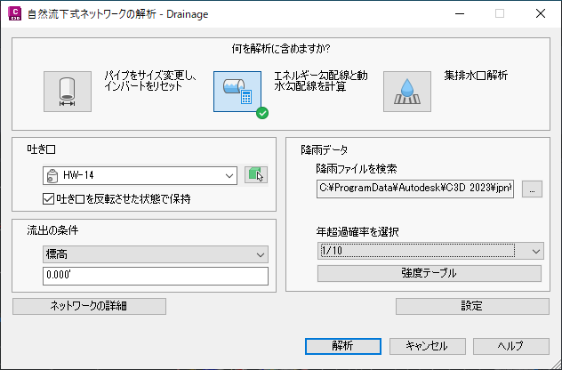 [パイプをサイズ変更し、インバートをリセット]、[エネルギー勾配線と動水勾配線を計算]、および[集排水口解析]の 3 つの解析タイプを選択できます。