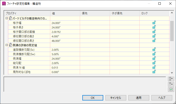 [フィーチャ設定を編集 - 構造物]ダイアログ ボックスで構造物の既定の設定を指定できます。