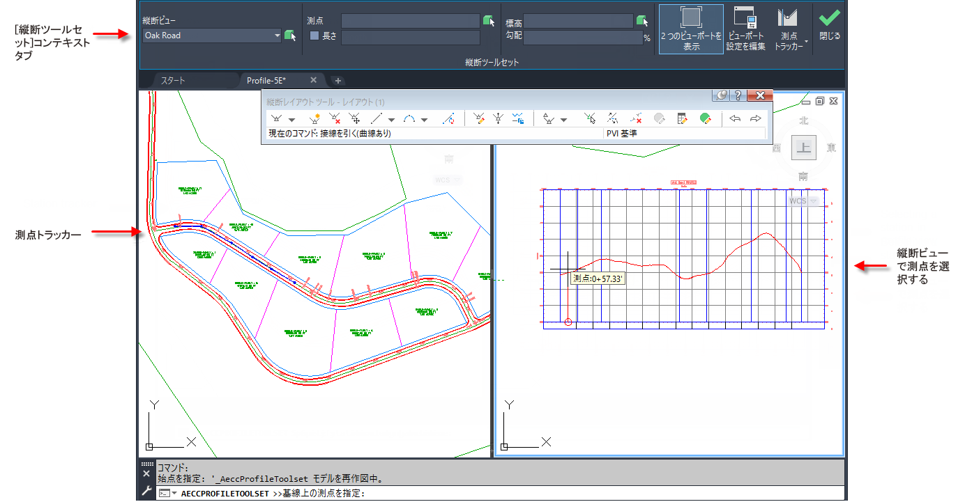 コマンドの実行時に、[割り込み]リボン タブの[縦断ツールセット]コマンドを選択し、[縦断ツールセット]コンテキスト リボン タブを表示できます。