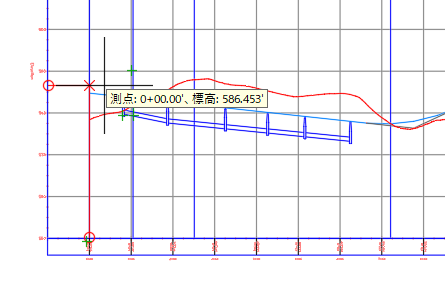最初に測点を指定するよう求められます。平面ビューまたは縦断ビューのいずれかをクリックすることにより、測点を選択できます。リボン上の[測点]フィールド内の測点値を入力または変更することもできます。