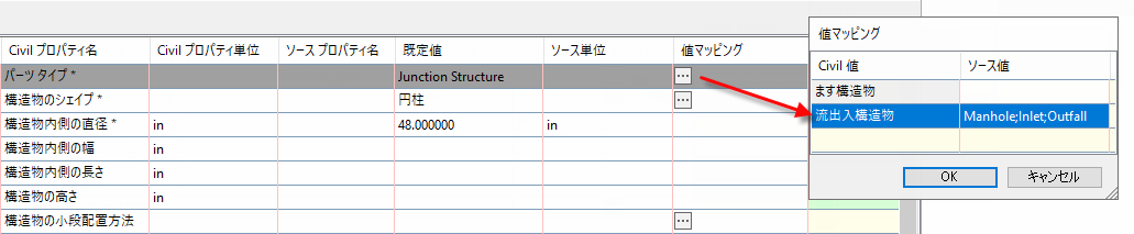 次の例は、[値マッピング]ダイアログ ボックスを使用して「Structure_type」属性のソース値をマップし、ます構造物として Civil 3D に取り込む方法を示しています。