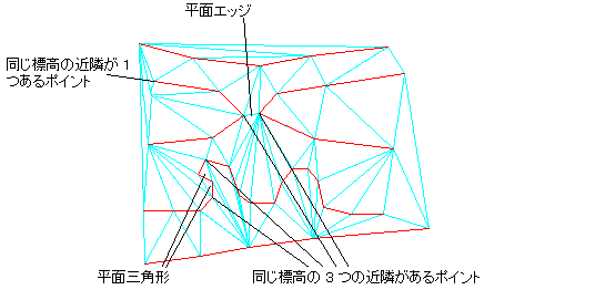 「複数の等高線」の状態は、あるポイントと同じ標高の隣接ポイントが 2 つ以上ある場合に発生し、通常はサーフェスの平面領域で検出されます。この状態が検出されたときは、[平面領域の最適化]操作を使用して問題を修正することができます。ポイントがサーフェス境界線上にある場合、その平面領域は単に、三角形分割プロセスによって意図せず生成された可能性があります。そのような三角形は、[線分の削除]操作を実行するか、非表示境界を追加することにより削除できます。