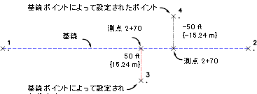 | 測点 | 割り当てるポイントの測点の位置です。 測点は現在の距離単位で入力します。たとえば、0、50、100 などと入力します。150 と指定した場合、その測点は基線に沿って 150 フィートまたは 50 メートルです。 |