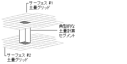 グリッド土量サーフェスは、ユーザ指定の基準サーフェスおよび比較サーフェス、さらにグリッド間隔とグリッド方向に基づく差異グリッド サーフェスです。