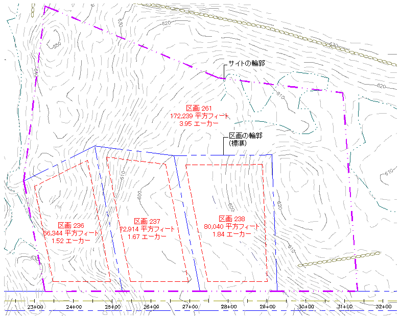 サイト区画には面積ラベルがあり、表示または非表示にすることができます。サイト区画境界の色および線種はコントロールできます。また、サイト区画内の区画境界の描画順序もコントロールすることができます。