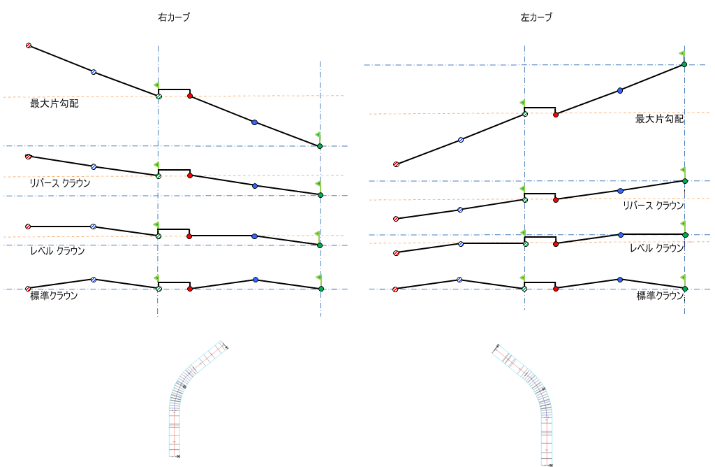 横断勾配摺り付け図の説明については、「概要 - 横断勾配摺り付け回転軸の基点設定方法」を参照してください。