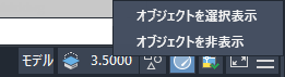 または、図面ウィンドウのステータス バーの右側にある をクリックし、[オブジェクトを非表示]をクリックして、隠したいオブジェクトを選択します。