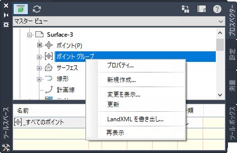 [ツールスペース]ウィンドウは、コマンド、スタイル、およびデータへのアクセスに不可欠なユーザ インタフェースです。このウィンドウから[プロスペクター]、[設定]、[測量]、および[ツールボックス]タブにアクセスできます。コマンドにアクセスするには、これらのタブの各コレクションまたはアイテムを右クリックしてください。