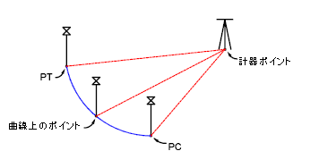 曲線の始点のショット、曲線の始点と終点間の円弧上のショット、曲線の終点のショット、これら 3 つのショットを使用して測量図形に曲線を作成します。