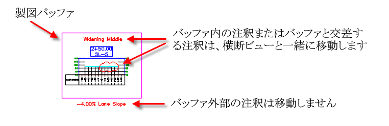 横断ビューの製図バッファに全体または一部が含まれるように追加した製図要素は、横断ビューにバインドされ、横断ビューを移動すると一緒に移動します。
