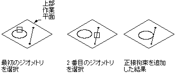 線分または曲線と曲線間で定義できます。2 本の線分を法線にすることはできません。代わりに垂線条件が適用されます。2 本の曲線が交差し、曲線の接線が交点で垂直になります。一般に、線分を楕円の法線に制約するために使用します。