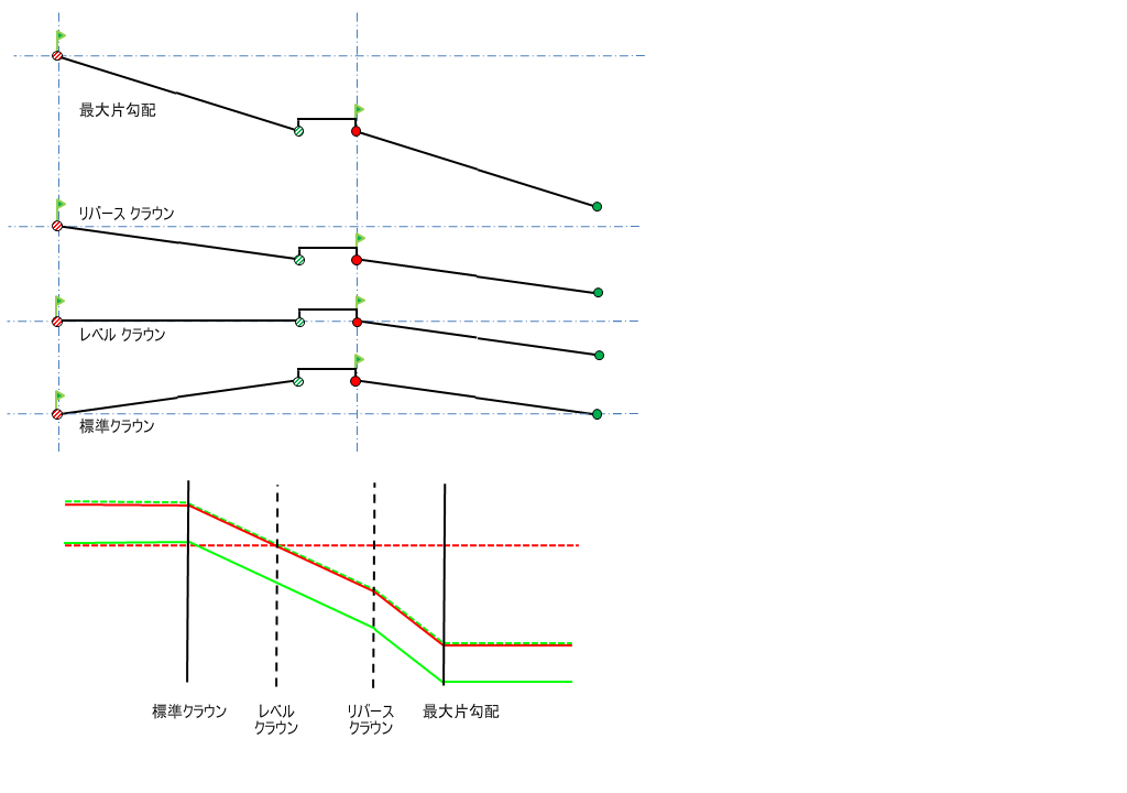 横断勾配摺り付け図の説明については、「概要 - 横断勾配摺り付け回転軸の基点設定方法」を参照してください。
