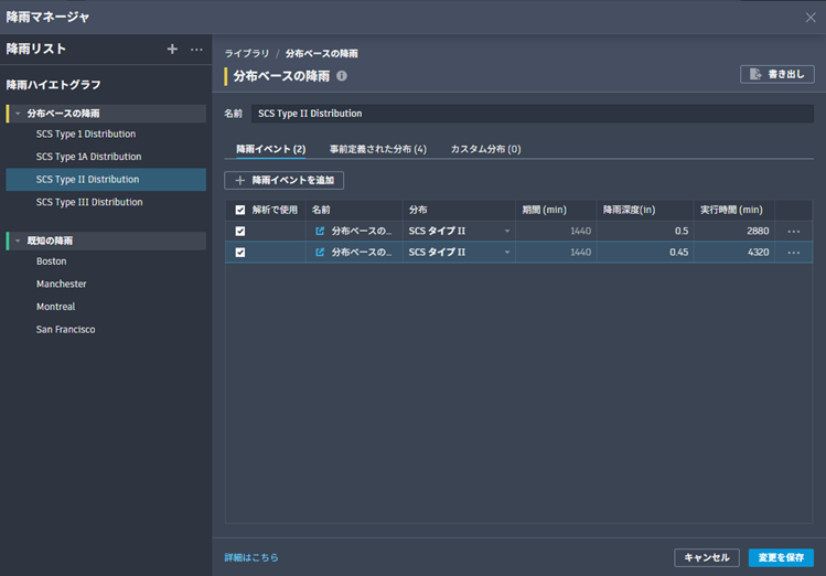 分布ベースの降雨は、降雨分布(時間的パターン)、期間、および降雨量に基づいて降雨イベントのセットを定義します。分布ベースの降雨セットでは、複数の分布ベースの降雨イベントを作成できます。降雨分布には、SCS 降雨で使用されるような事前定義された分布や、ユーザが定義したカスタム分布が含まれており、これらはすべて降雨ライブラリ内のすべての分布ベースの降雨セットで使用可能です。