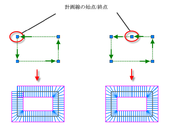 この問題を回避するには、右の図に示すように、計画線を描画するときに、コーナー以外の場所から開始してコーナー以外の場所で終了することをお勧めします。