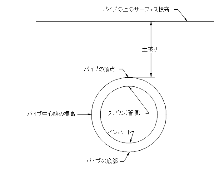 クラウンまたは管頂:パイプ内側の上端の標高。