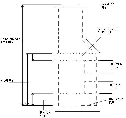 排水溜め、排水溜めの深さ:排水溜めとは、排水ますなど、ます構造物内の底部または空間を指します。排水溜め領域は、排水の貯蔵所として使用される場合があります。排水溜めの深さとは、構造物の内底から、その構造物に接続している全パイプの低い位置にあるインバートまでの距離を指します。特定タイプの構造物の排水溜めの深さは、設計要件によって異なります。通常、マンホールに排水溜めの深さはありません。