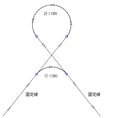 次の図に、2 つの固定線分の間の非固定曲線フィレットを示します。曲線の角度に基づいて、2 通りの解決が存在します。