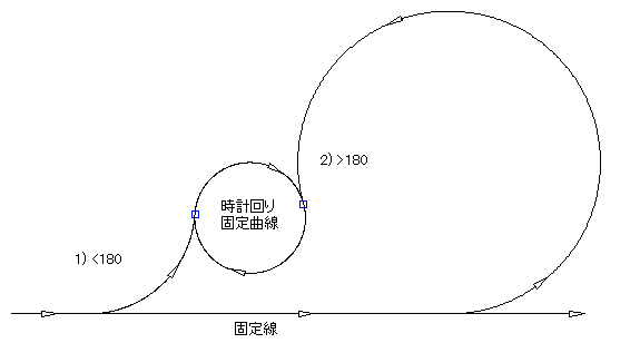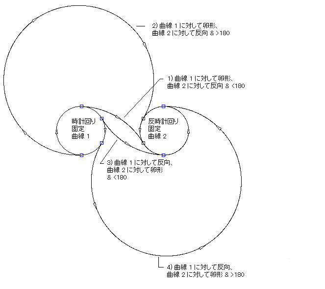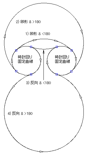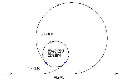 次の図に、時計回りの固定曲線と反時計回りの固定曲線の間の非固定曲線フィレットを示します。