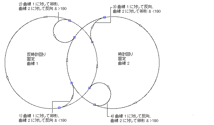 次の図に、重なった時計回りの固定曲線と反時計回りの固定曲線の間の非固定曲線フィレットを示します。