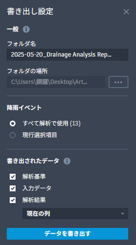 - [降雨イベント]で、解析データとともに書き出す降雨イベントを選択します。イベントごとに新しい *xlsx ファイルが作成されます。