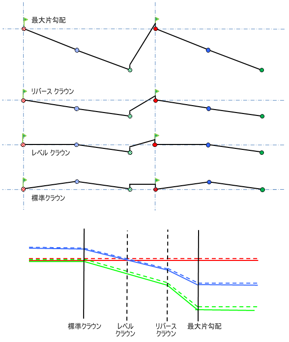 横断勾配摺り付け図の説明については、「概要 - 横断勾配摺り付け回転軸の基点設定方法」を参照してください。