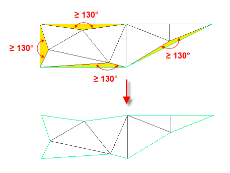 - [隣接する TIN 線分間の最大角度]が 130 °に設定されると、次の図のハイライト表示された三角形が削除されます。