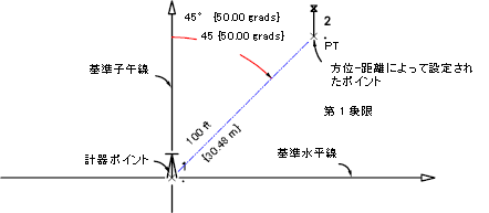 ポイント 2 は、方位 45°0'0"(50 グラード)、象限 1(NE)、計器ポイントからの距離 100 フィート、注釈 PT によって配置されます。