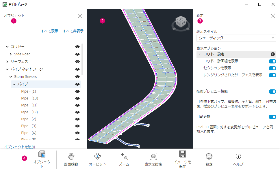 をクリックして、このパネルの表示/非表示を切り替えられます。詳細については、「Civil 3D モデル ビューアの設定パネル」を参照してください。