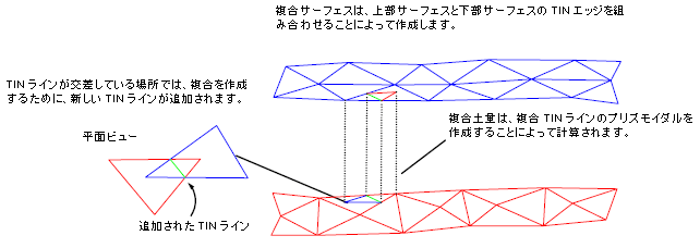 この方法では、両方のサーフェスのポイントと、2 つのサーフェス間の三角形のエッジが交差するすべての場所のポイントが使用され、複合 TIN ラインからプリズモイダル セグメントが作成されます。