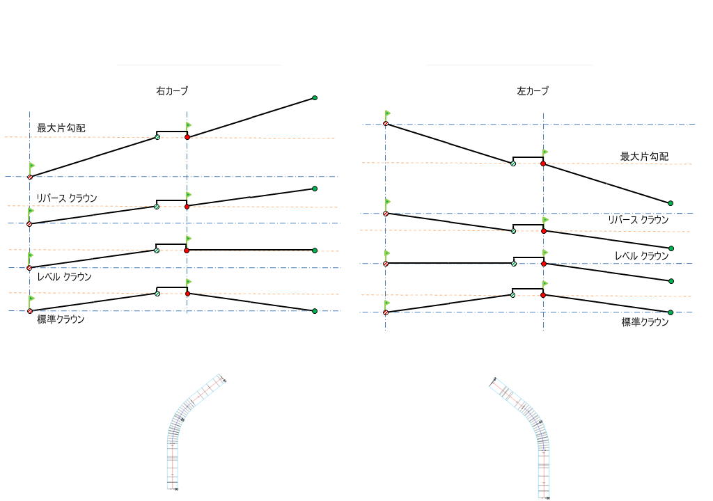 横断勾配摺り付け図の説明については、「概要 - 横断勾配摺り付け回転軸の基点設定方法」を参照してください。