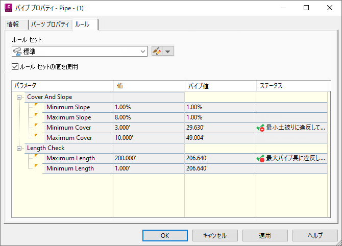 たとえば、最小土被りや最大土被りの制約に違反がある場合や、ある条件に関して注意が必要な場合でも、パーツに対してルールが適用されていれば、違反チェックによりその旨が通知されます。