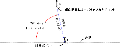 ポイント 3 は、距離 200 で、後視線の延長線から右に 85.2657 偏角させることによって配置します。接尾語を指定しない場合、角度と距離は現在の単位で指定されます。