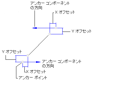 - 始点と終点: 線分コンポーネントの始点と終点を固定するには、この方法を使用します。線の長さと角度はアンカー オブジェクトの位置によって決まり、アンカー コンポーネントが編集されると調整されます。次の図は、この方法を使用して定義した線分を示しています。