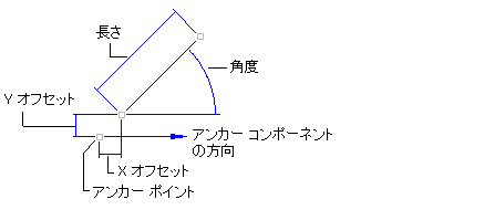 - 始点、長さ、角度: 線分コンポーネントの始点をアンカー コンポーネントに固定するには、この方法を使用します。その後、長さと角度を指定します。次の図は、この方法を使用して定義した線分を示しています。