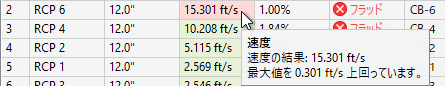 速度が [設定] で指定されている最小速度未満、または最大速度を超えている場合、この列は赤色でシェーディングされます。セルの上にカーソルを合わせると、最小値を下回っている量、または最大値を上回っている量を示すツールチップが表示されます。