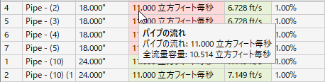 この行は、[一般]ページで [パイプをサイズ変更し、インバートをリセット] または [エネルギー勾配線と動水勾配線を計算] が選択されている場合に表示されます。