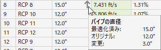 [一般]ページで [パイプをサイズ変更し、インバートをリセット] 解析タイプが選択され、パイプ直径がサイズ変更された場合、この列には上矢印または下矢印のいずれかが表示されます。矢印の上にカーソルを合わせると、パイプのサイズ変更について説明するツールチップが表示されます。