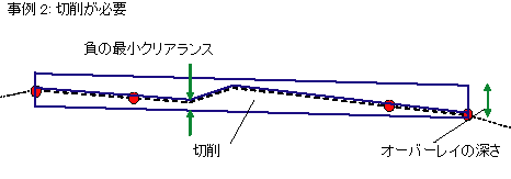 このレポートの生成元となるコリドーは、切削サブアセンブリのいずれかを使用して作成している必要があります。Autodesk Civil 3D では、切削が行われる測点のコリドー、コリドーでの切削幅、現況地盤サーフェスより下の切削領域、およびサブアセンブリのオーバーレイより上の切削領域をスキャンします。