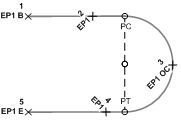 EP1 はアクティブな図形の名前で現在のポイントまで続行されます。“ “ (スペース)はフィーチャ/コードの区切り文字です。BC は現在のポイントが曲線セグメントの始点であることを示します。 このコードが定義されている現在のポイントは、曲線の最初のポイントです。同じ図形名の次のポイントは、曲線上のポイントと見なされます。<曲線を開始> コードに対応して <曲線を終了> コマンドが使用されていない場合、同じ図形名の 3 番目のポイントが曲線の終点になります。 |
