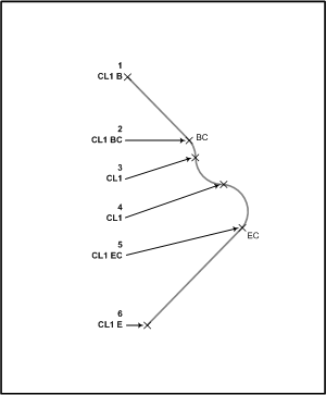 曲線フィット - マルチポイントの曲線: 次の図では、各ポイントに同じ図形名 CL1 が付いており、OC <曲線上のポイント> コードが定義された 4 つ以上の連続するポイントがあります。曲線セグメントの始点には BC <曲線を開始> コード、曲線セグメントの終点には EC <曲線を終了> コードがあります。作成される図形には、最初の CL1 ポイントに曲線の始点(BC)、最後の CL1 ポイントに曲線の終点(EC)があります。図形 BC の頂点と 図形 EC の頂点間にある各ポイントを複心曲線および反向曲線が通過します。 ![]() |