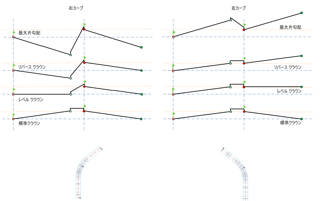 横断勾配摺り付け図の説明については、「概要 - 横断勾配摺り付け回転軸の基点設定方法」を参照してください。
