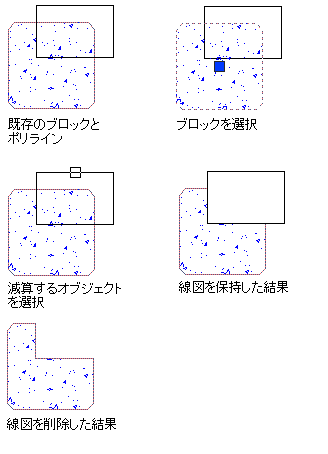 残っているコンポーネントのいずれも作図し直す必要はなく、線図または線図を含むブロックから選択された部分を減算します。減算する部分には、線分、ポリライン(閉じたまたは開いた)、円弧、円、テキスト、またはハッチングを含むことができ、あるいはこれらで作図したものであってもかまいません。この減算操作によって閉じたポリラインの一部を削除した場合、ポリラインは閉じたものとして再作成されます。この減算操作によって閉じたポリラインが 2 つに分割された場合、分割後の 2 つの部分とも閉じたポリラインとして再作成されます。しかし、減算がハッチングを 2 分割するとき、ハッチングは、どちらかの部分をクリックして選択できる一つの線図図形のままで残っています。